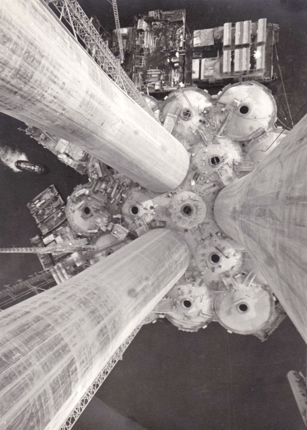 Var anleggsarbeider på Condeep: Statfjord A, Brent B, Beryl C i 1974 i Hinnavågen, Stavanger, Rogaland, Norge.