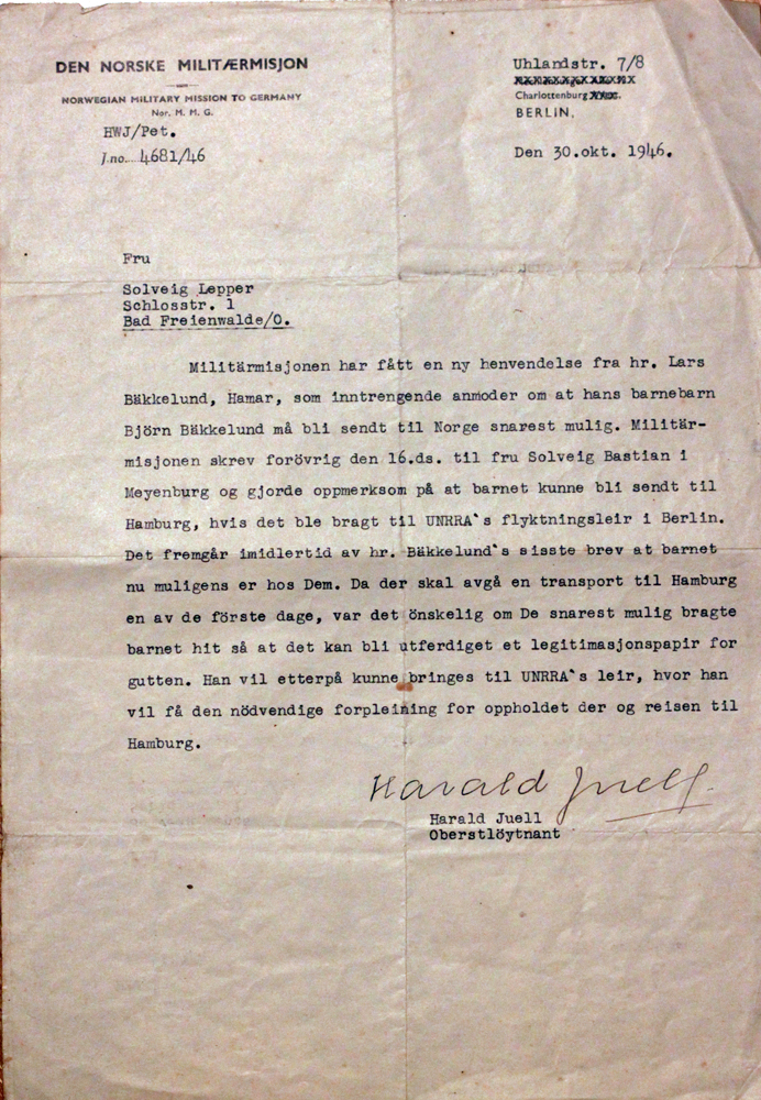 I 1946 sendte bestefar Lars brev til lederen for den Norske militærmisjonen i Berlin for å få meg tilbake til Norge.