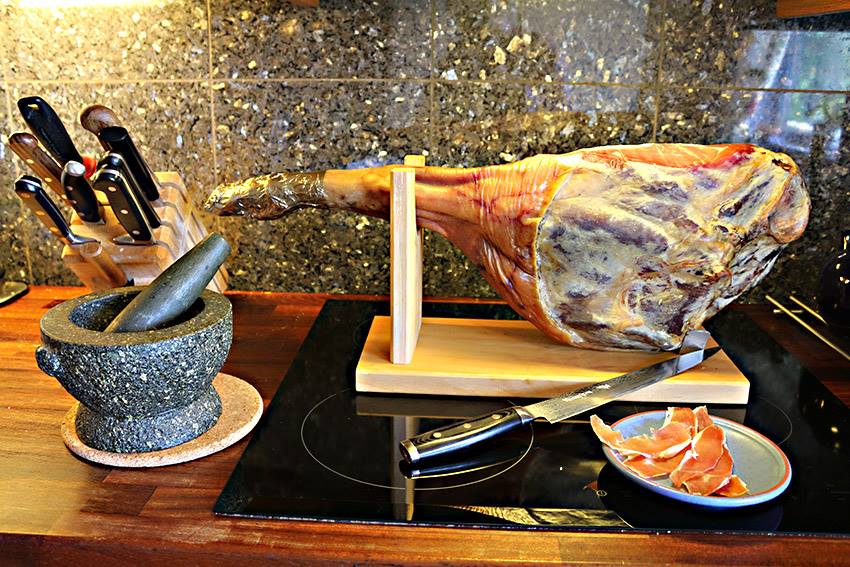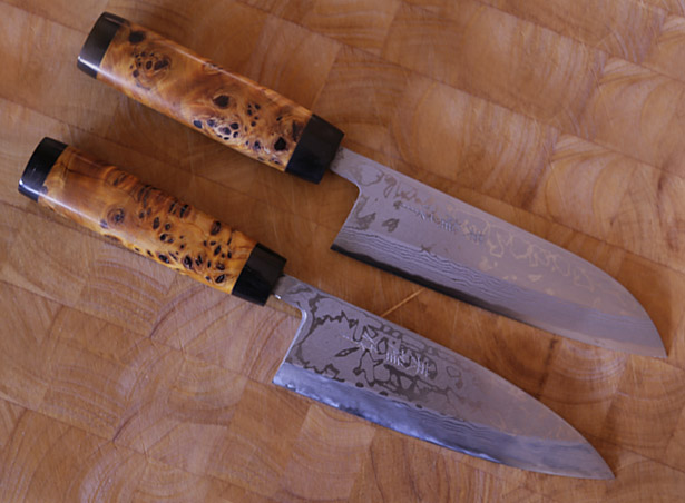 Til Høyre ser du to japanske kjøkkenkniver. En Deba og en Santoku..Skaftet er av stabilisert poppel, endene av bøffelhorn.